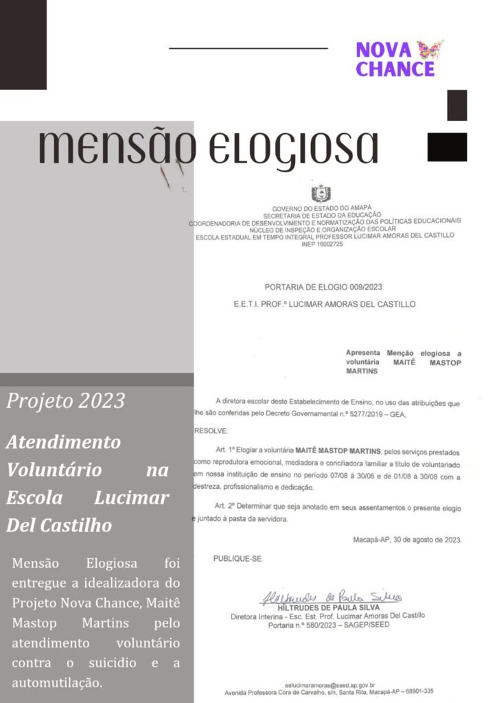 Há exatos 2 anos o Projeto Nova Chance foi convidado pela escola estadual Lucimar Del Castilho, para ajudar alunos com registros de automutilação e pensamento suicida.